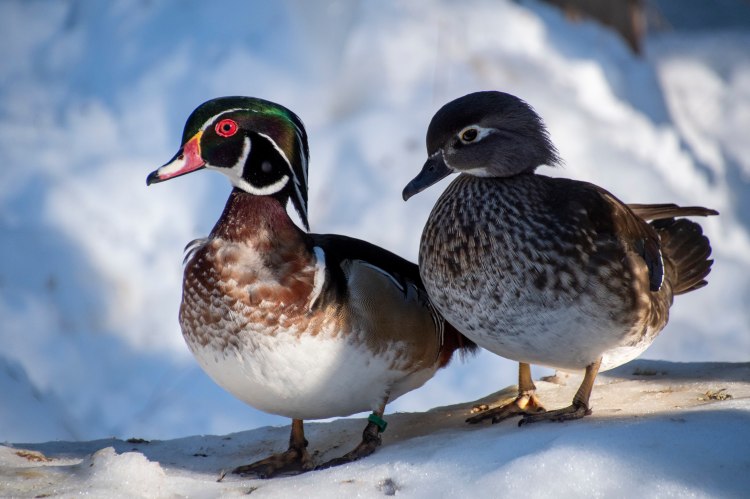 Wood Ducks are an average sized duck, weighing about 2-3 pounds. The males can easily be spotted when in color because they have a distinctive green, blue, and purple head. Their bills are a reddish pink and their eyes are red. The females are a smoky brown color and have a distinctive white ring around their dark eyes. They have a blue iridescence in their wing feathers. Their bills are a smoky color – not red as on the males.