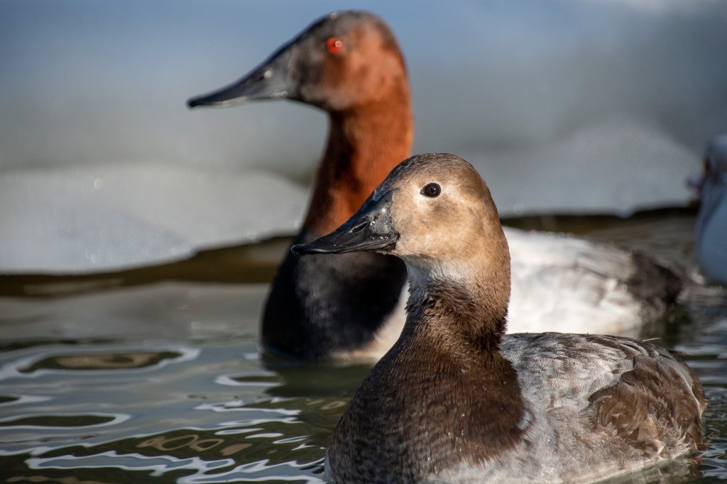 Identifying Canvasbacks is fairly easy, though they do resemble a Redhead Duck. Canvasback Duck females are a pale brown and gray, and have dark eyes. Breeding males, however, have white bodies with black on the chest and the rump. Their heads are a chestnut color and their eyes are red.