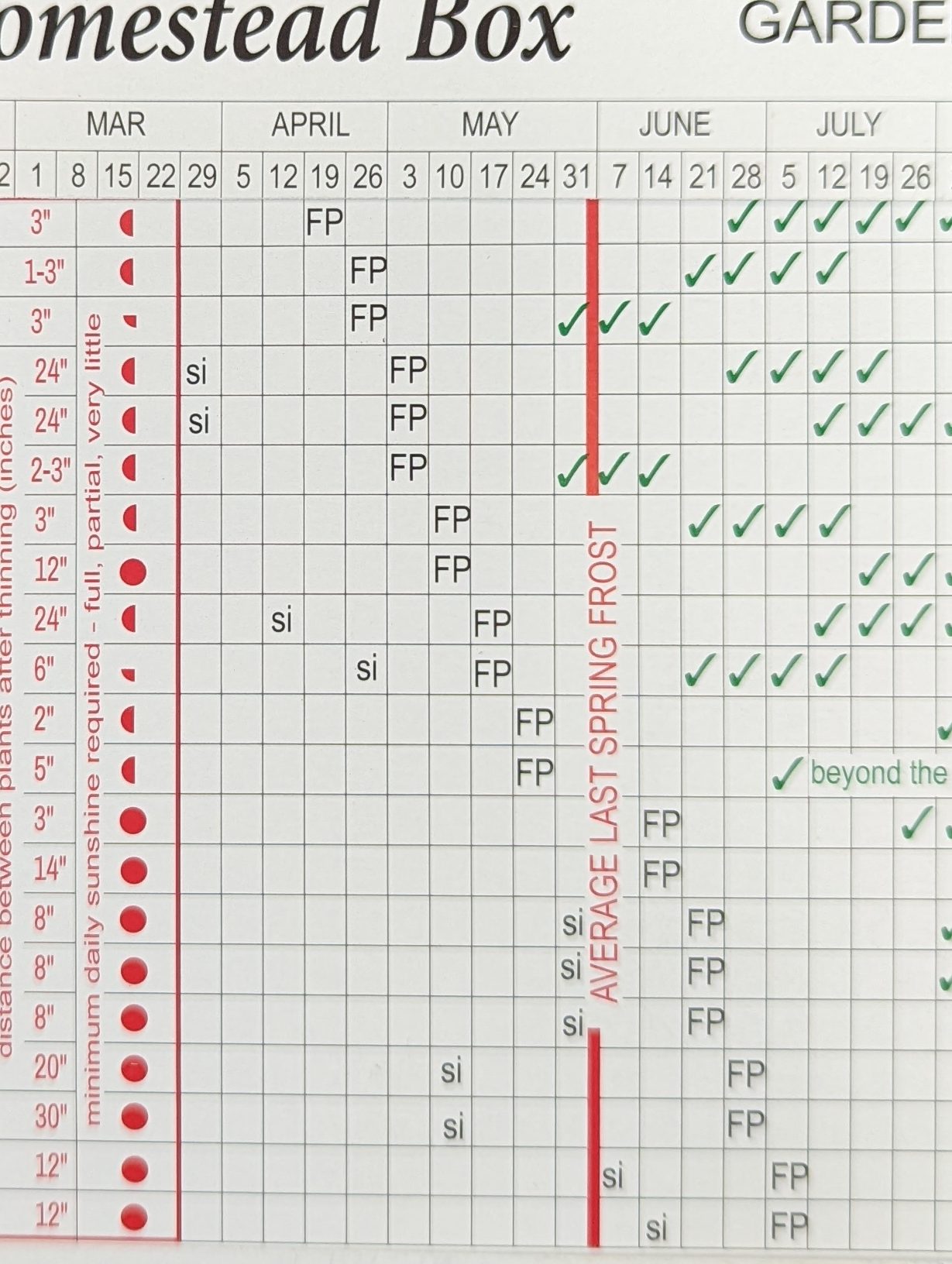 The planner also has first outdoor planting dates. We get our last frost sometime around the end of May. Most people up here don’t plant frost sensitive stuff until June 1 at the earliest. I am always in a hurry and put seeds in the ground about the 25th of May. Frost doesn’t hurt plants that haven’t emerged from the ground yet. For assurance this year, I have purchased fleece ground cover for the early days. In the past, we have used buckets and blankets to cover plants. The blankets always crushed plants and the buckets worked as long as we remembered to put a rock on each one. One drawback to using the row cover or blankets is that frost can often still make it to the plants if the covering is touching the plants. I wish I had known that when I was younger.