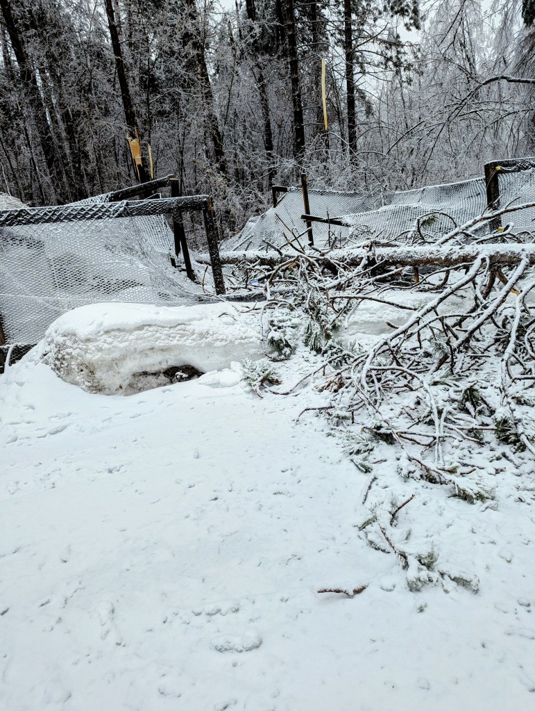 Then, on day three, a large red pine tree on our neighbor’s tree plantation fell – not just the top of the tree but the entire 70 foot tall thing. And fell smack on top of our main aviary and ponds.