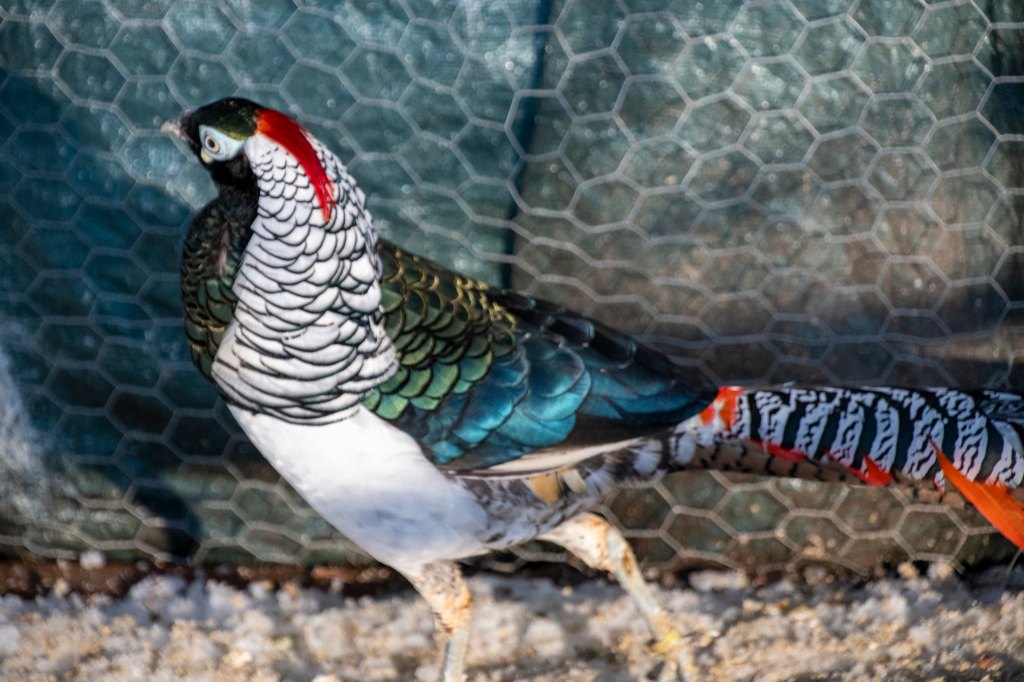 The “Red” Golden Pheasant is purported to be the original color and the variations (yellow golden, buff, etc.) are thought to be mutations as the result of cross breeding between Lady Amherst Pheasants and Golden Pheasants. In fact, their territories in China overlap somewhat and the birds are quite similar. In captivity, Lady Amhersts and Goldens have been cross bred successfully and they must be kept apart by breeders who intend to keep the bloodlines pure. Notice the red streak on the crest of the Lady Amherst Pheasant below. If you see this red streak in a Golden Pheasant’s crest, you can infer that the bloodline has been compromised.