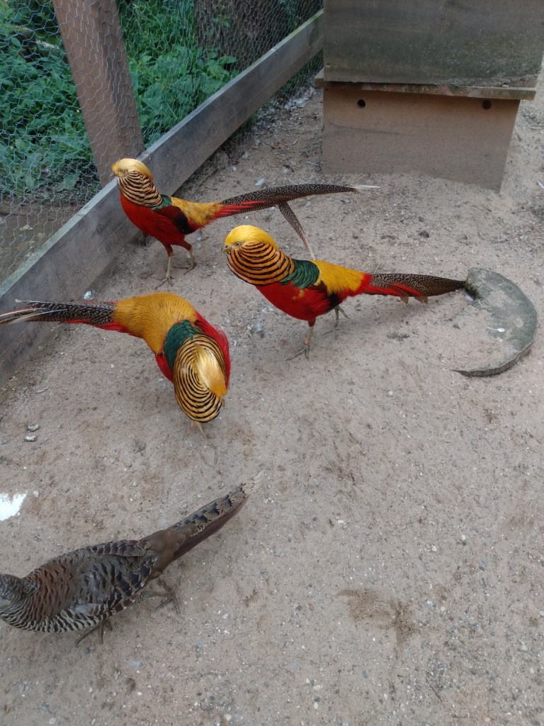The Goldens in captivity usually eat a variety of insects and seeds. They love some berries – and the tomatoes I give them are a special treat. They need access to clean water, as does any animal. They are not especially difficult to keep and some people think they are splendid pets. Interestingly, some pheasants can form a bond of sorts with their owners. When our Goldens see us with treats in hand, they are often bold enough to come close enough to pet. However, they don’t enjoy anyone trying to catch them – and who would? If you have children, please teach them to be gentle with your pheasants and other “livestock”. While they normally won’t attack anyone, they can be physically harmed by the chase.